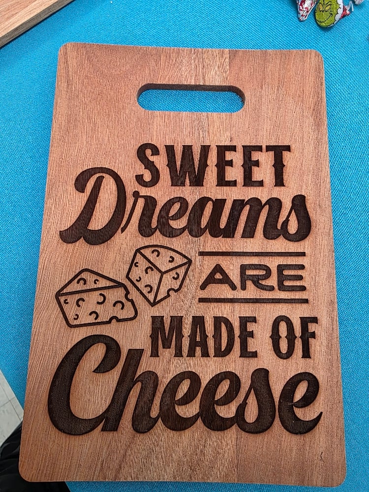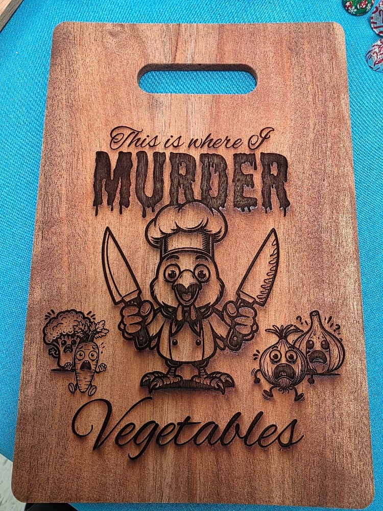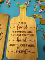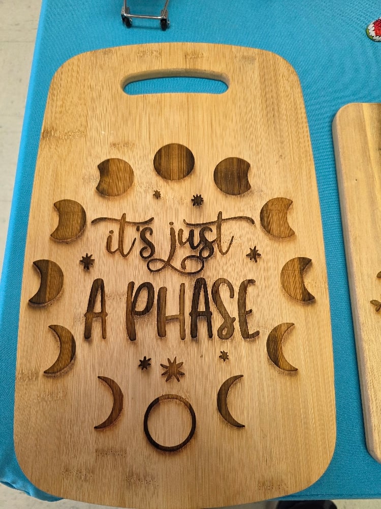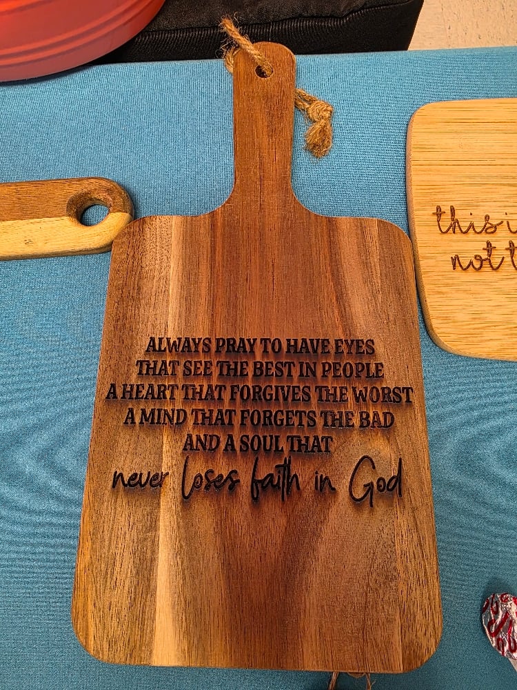 Laser engraved wooden cutting boards. We have different shapes, sizes, and sayings engraved on each.